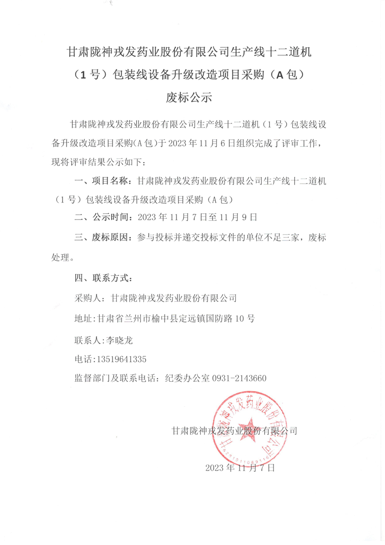 甘肅隴神戎發(fā)藥業(yè)股份有限公司生產(chǎn)線十二道機(jī)(1號(hào))包裝線設(shè)備升級(jí)改造項(xiàng)目采購(gòu)(A包)廢標(biāo)公示