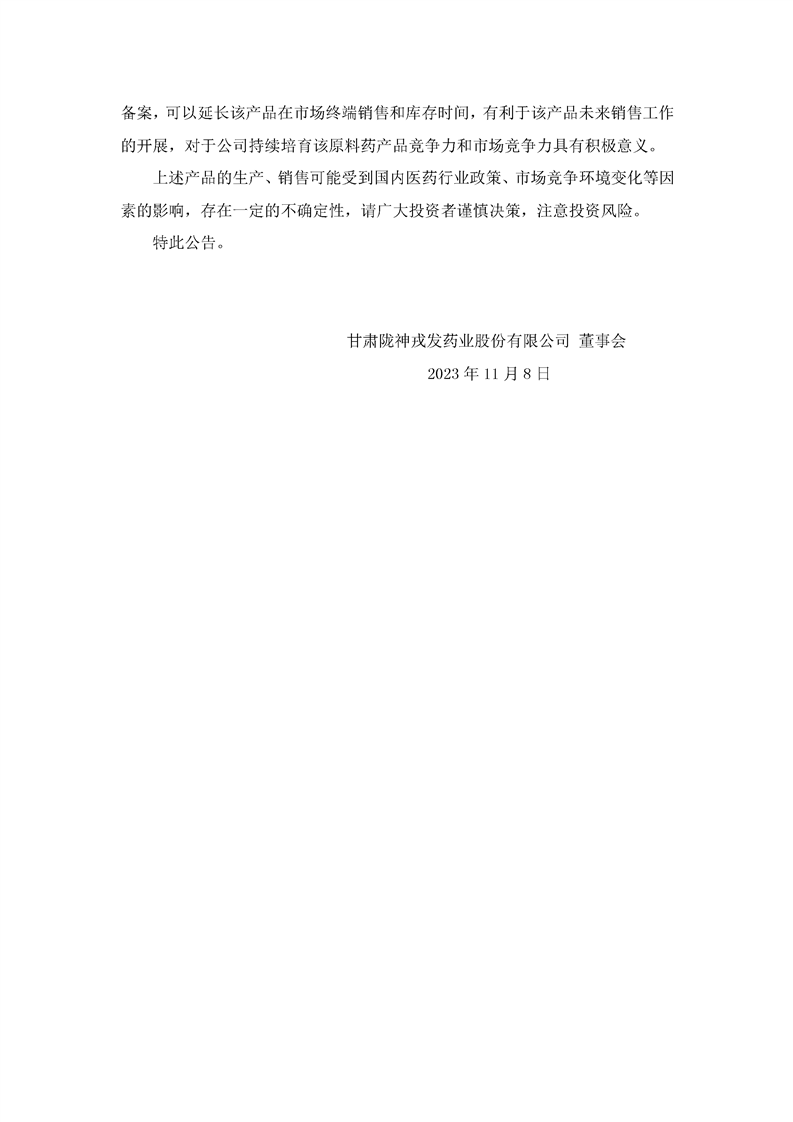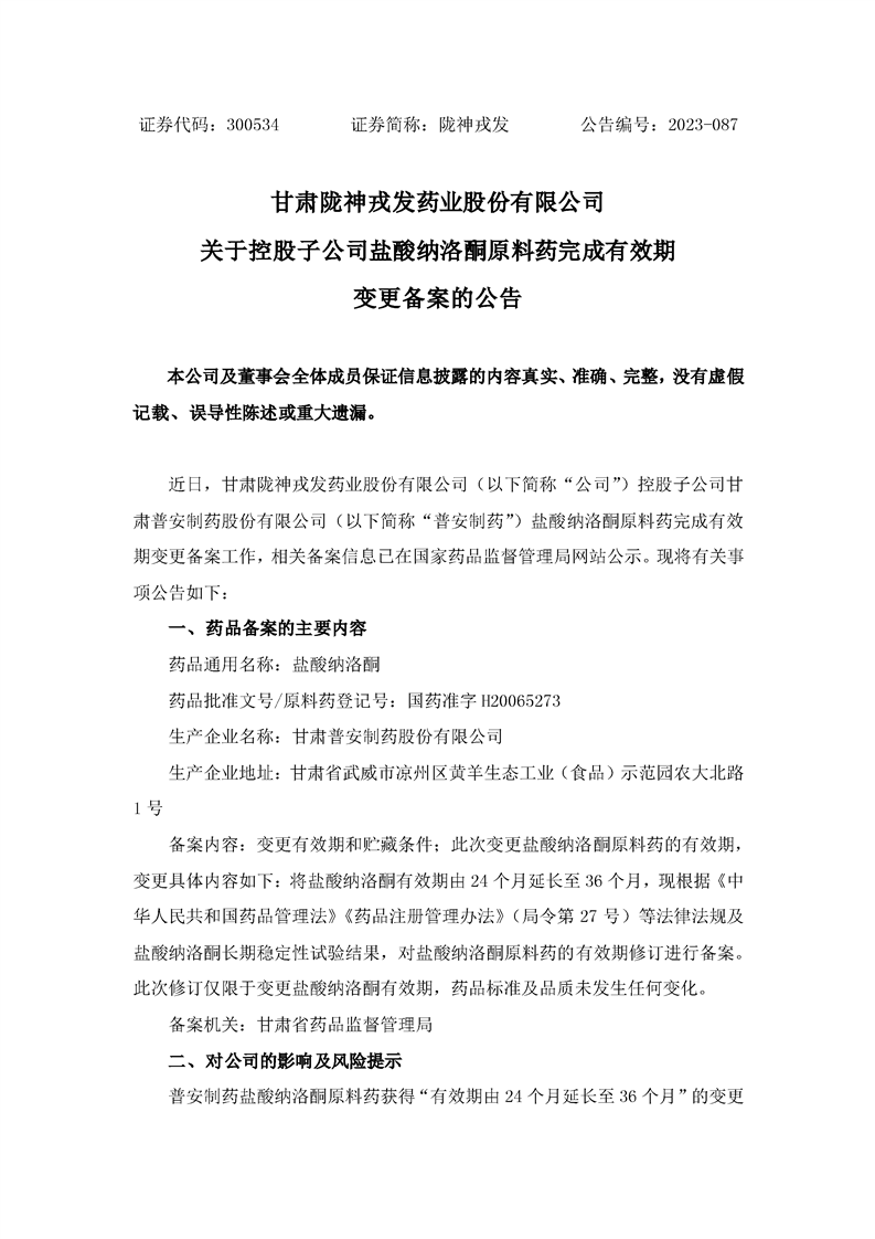 關(guān)于控股子公司原料藥鹽酸納洛酮完成有效期變更備案的公告
