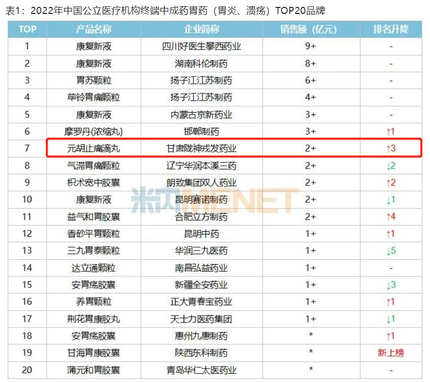 據(jù)統(tǒng)計(jì),我國(guó)胃腸疾病患者有1.2億人,且發(fā)病率越來(lái)越高。據(jù)米內(nèi)網(wǎng)最新數(shù)據(jù)顯示,2022年中國(guó)公立醫(yī)療機(jī)構(gòu)終端中成藥胃藥(胃炎、潰瘍)銷售額保持在70億元水平。其中甘肅隴神戎發(fā)藥業(yè)的元胡止痛滴丸銷售額超過(guò)2億元,在2022年中國(guó)公立醫(yī)療機(jī)構(gòu)終端中成藥胃藥(胃炎、潰瘍)TOP品牌排名第七。