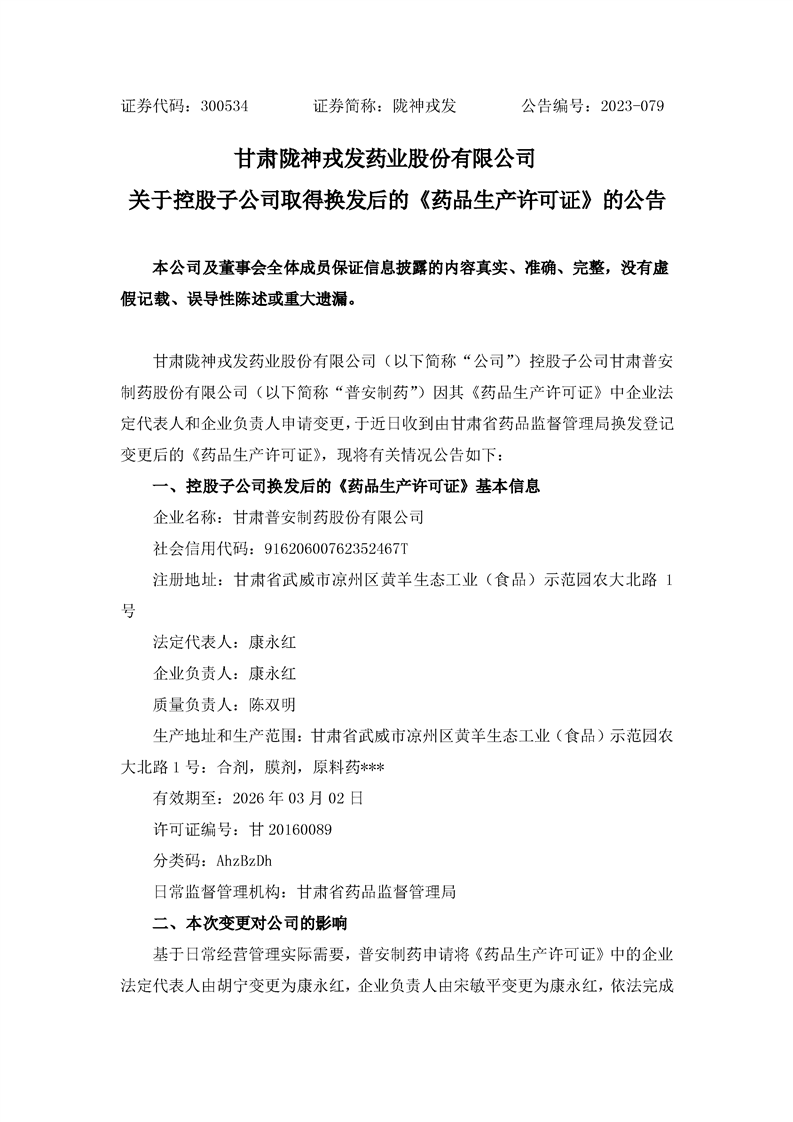 關(guān)于控股子公司取得換發(fā)后的《藥品生產(chǎn)許可證》的公告
