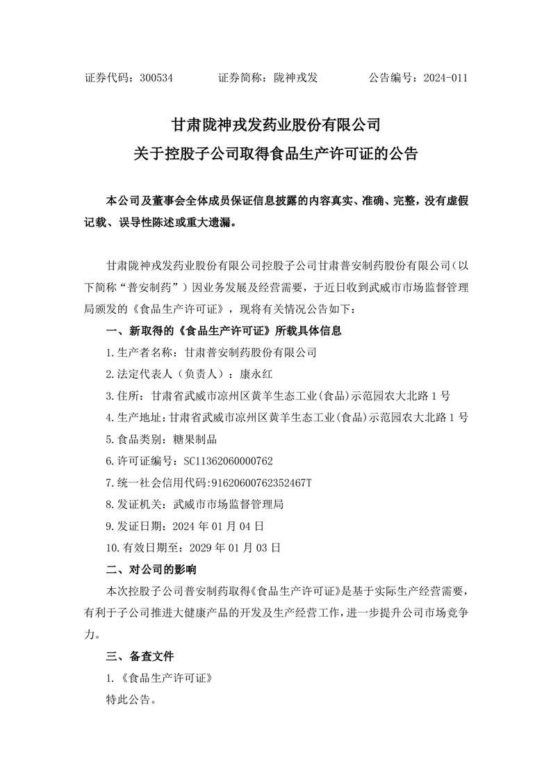 關于控股子公司取得食品生產(chǎn)許可證的公告