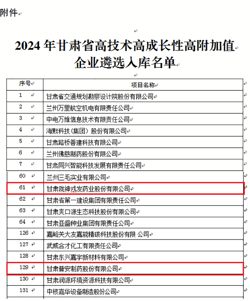 喜訊!隴神戎發(fā)與普安制藥入選2024年甘肅省高技術高成長性高附加值企業(yè)入庫名單