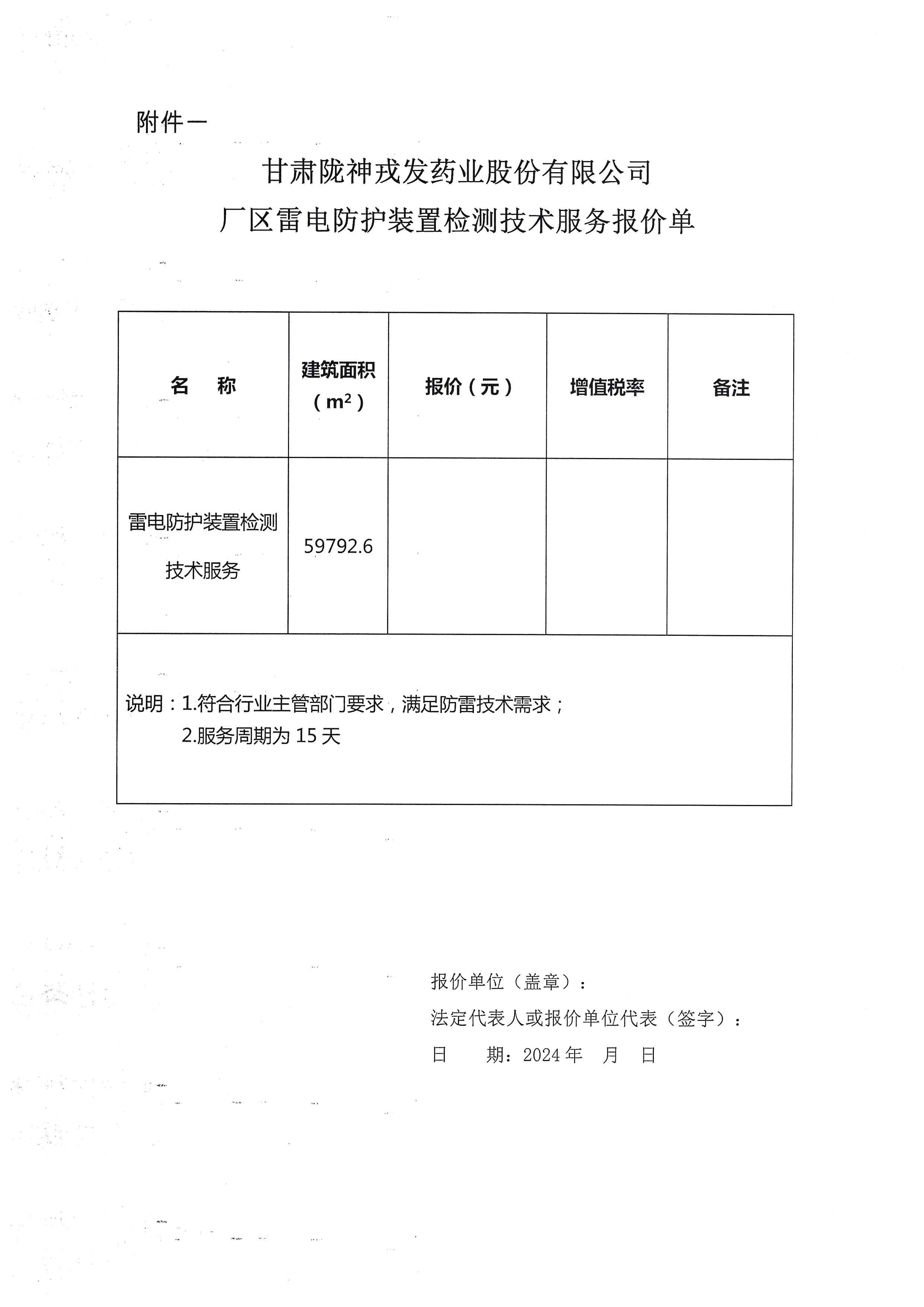 甘肅隴神戎發(fā)藥業(yè)股份有限公司廠區(qū)雷電防護(hù)裝置檢測(cè)技術(shù)服務(wù)詢價(jià)公告