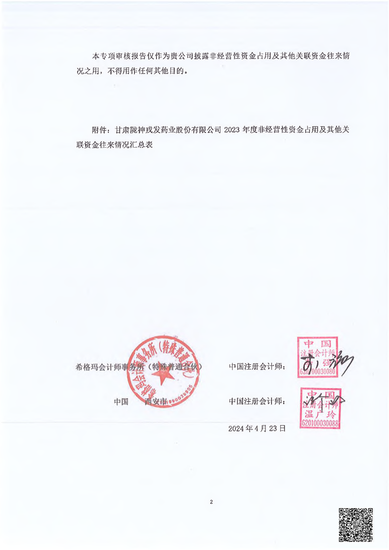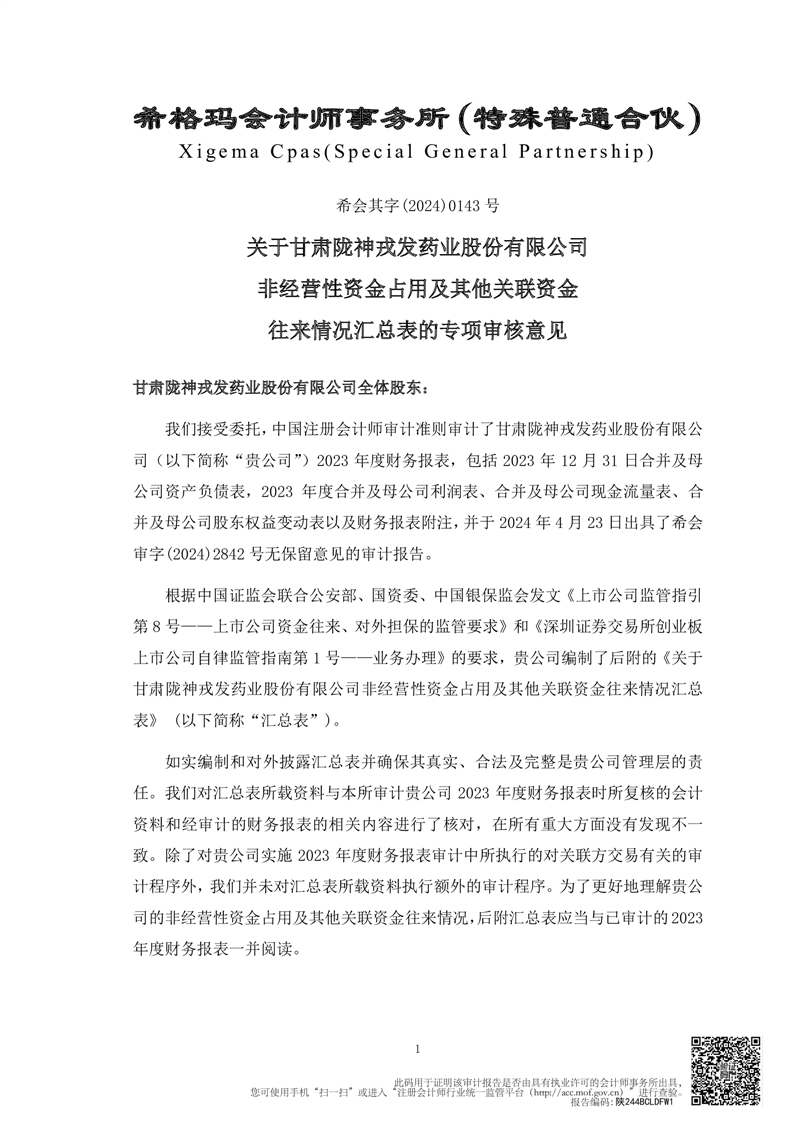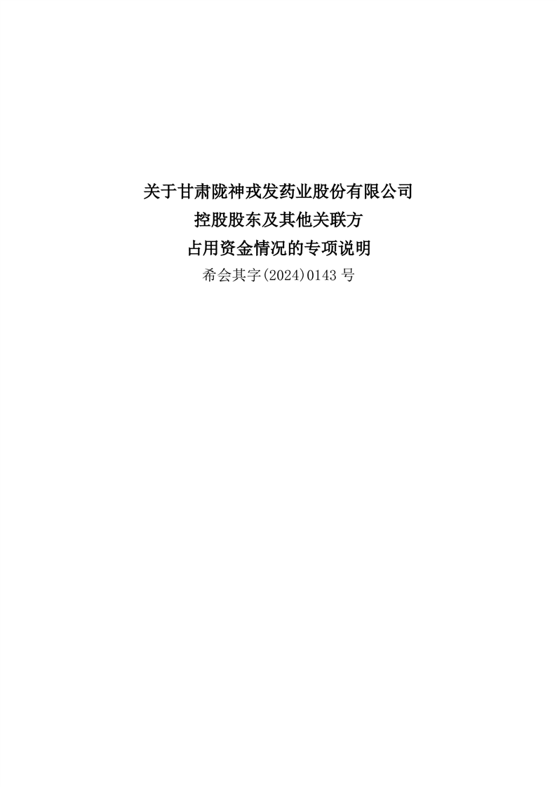 關于甘肅隴神戎發(fā)藥業(yè)股份有限公司控股股東及其他關聯(lián)方占用資金情況的專項說明