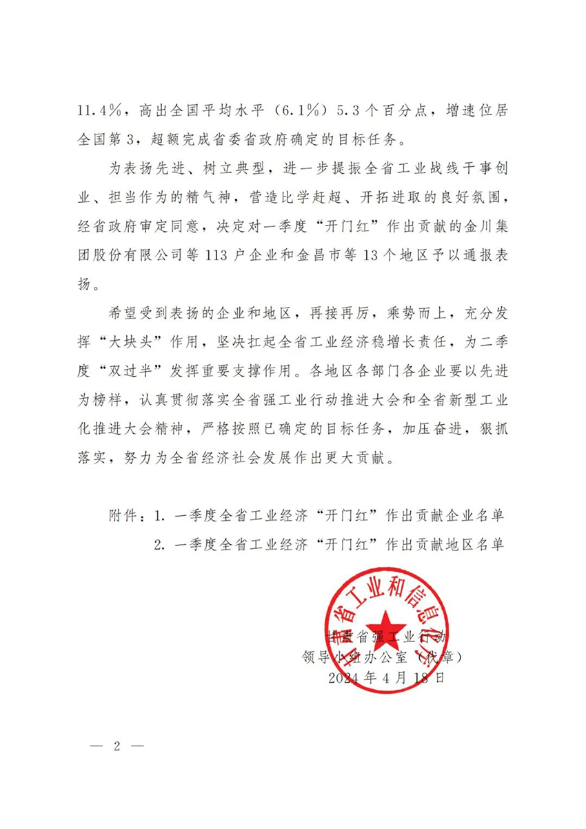 根據(jù)《甘肅省強(qiáng)工業(yè)行動領(lǐng)導(dǎo)小組辦公室關(guān)于表揚(yáng)2024年一季度全省工業(yè)經(jīng)濟(jì)“開門紅”作出突出貢獻(xiàn)企業(yè)和地區(qū)的通報》(甘工信發(fā)〔2024〕96號),甘肅藥業(yè)集團(tuán)及子公司普安制藥被省工信廳評為2024年一季度全省工業(yè)經(jīng)濟(jì)“開門紅”作出貢獻(xiàn)企業(yè)并給于通報表揚(yáng)。