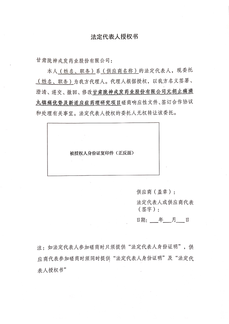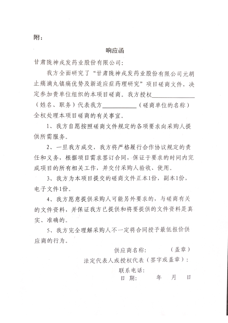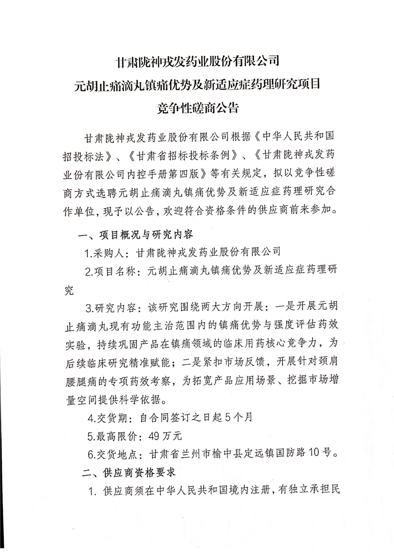 甘肅隴神戎發(fā)藥業(yè)股份有限公司元胡止痛滴丸鎮(zhèn)痛優(yōu)勢(shì)及新適應(yīng)癥藥理研究項(xiàng)目競(jìng)爭(zhēng)性磋商公告