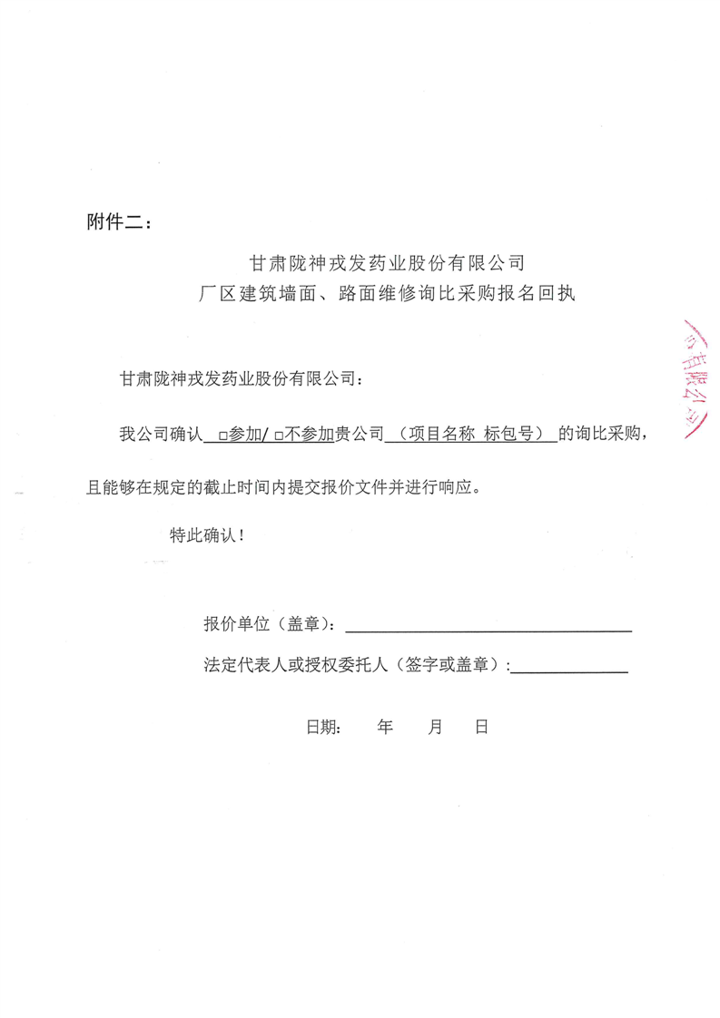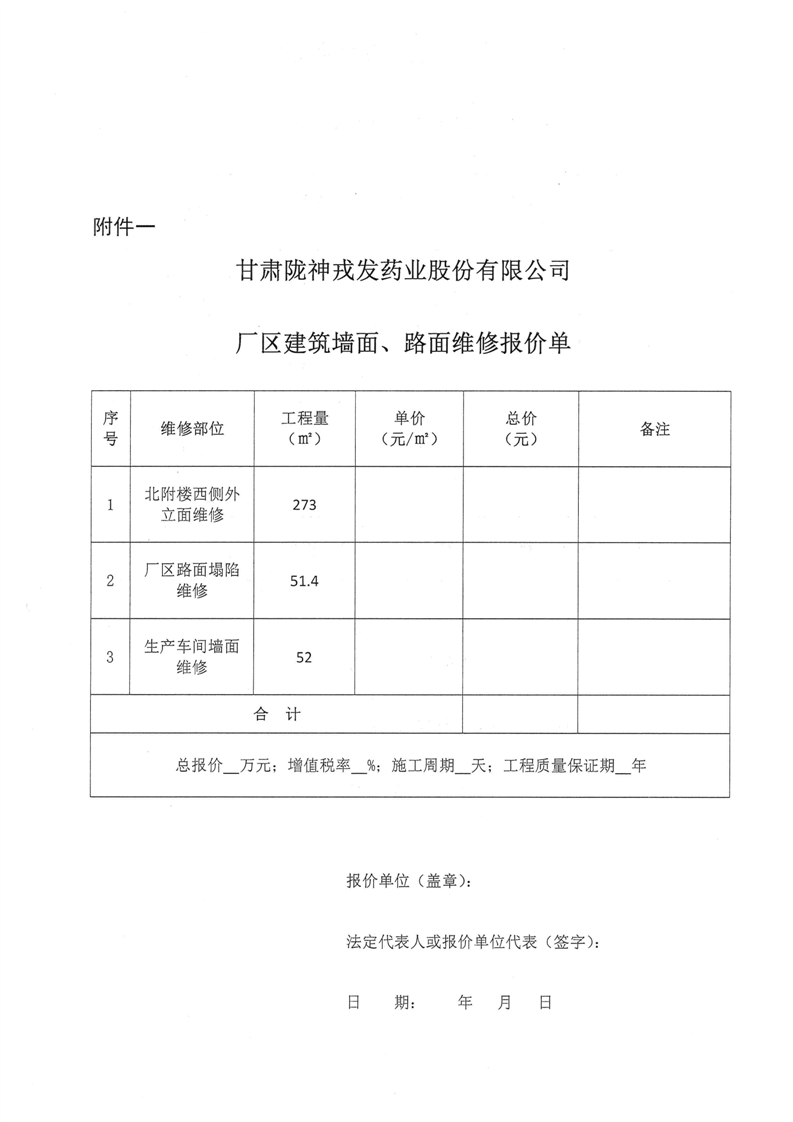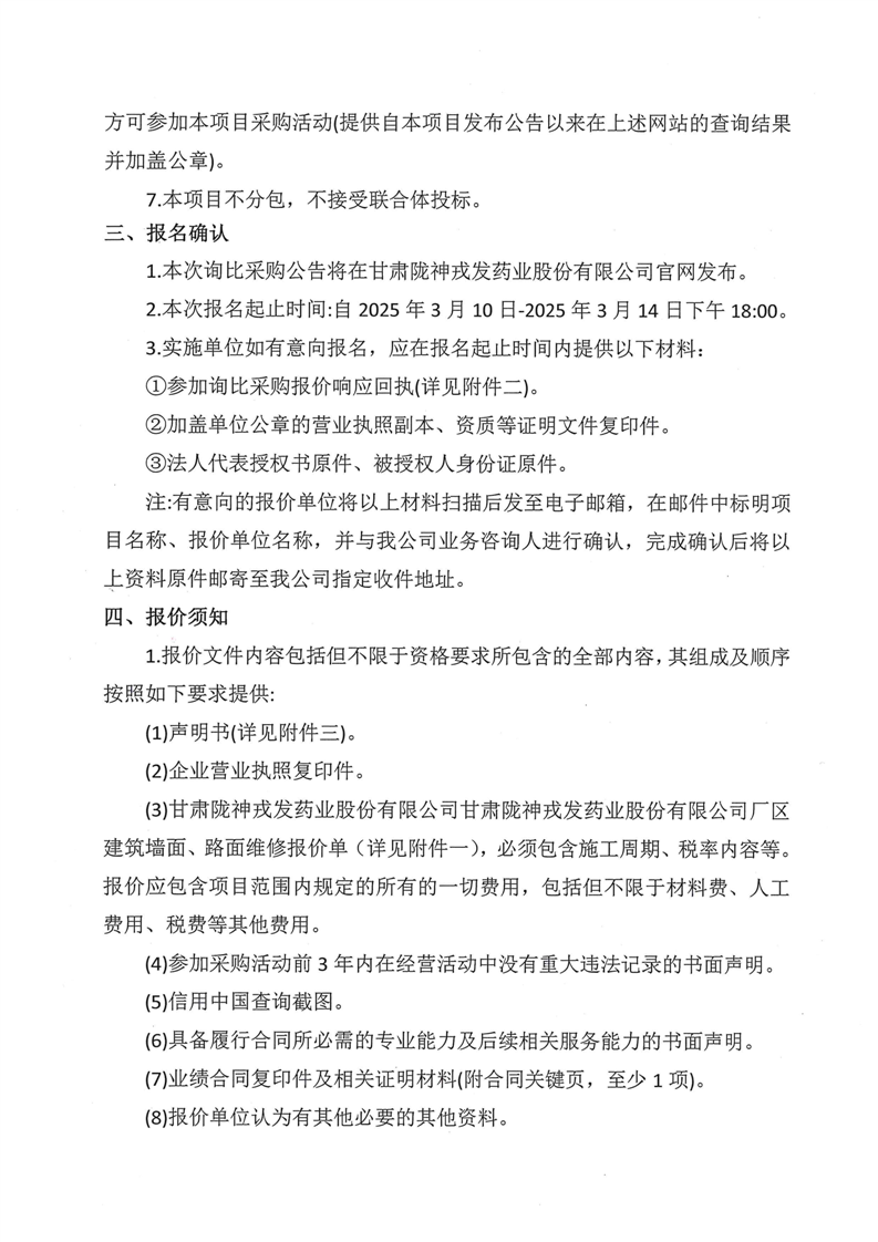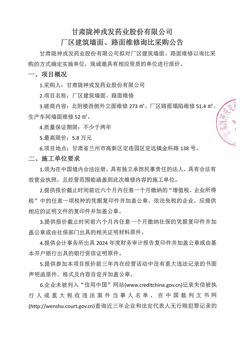 甘肅隴神戎發(fā)藥業(yè)股份有限公司廠區(qū)建筑墻面、路面維修詢比采購(gòu)公告