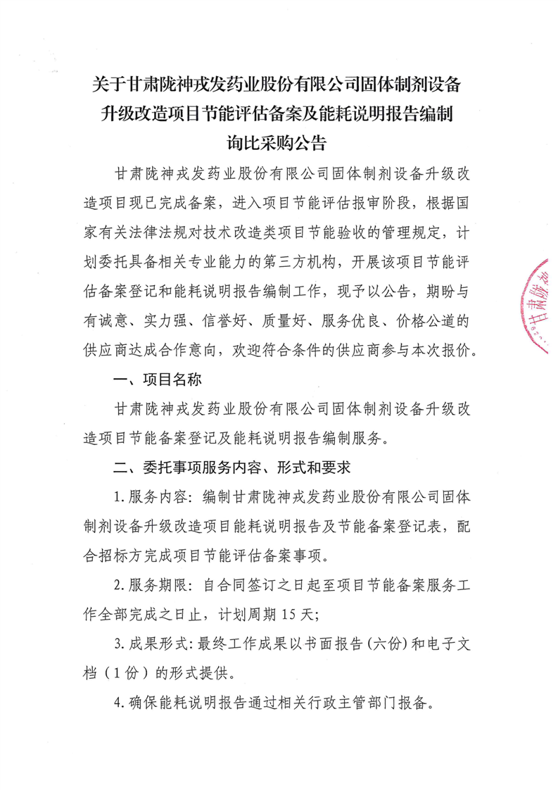 關于甘肅隴神戎發(fā)藥業(yè)股份有限公司固體制劑設備升級改造項目節(jié)能評估備案及能耗說明報告編制詢比采購公告