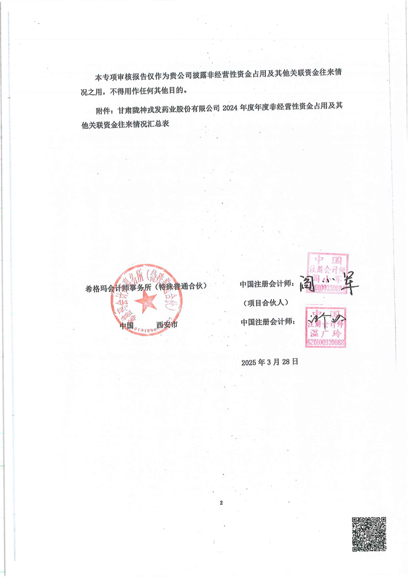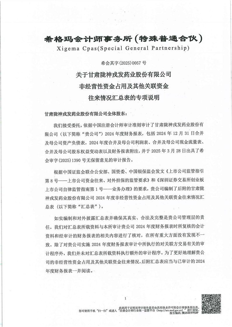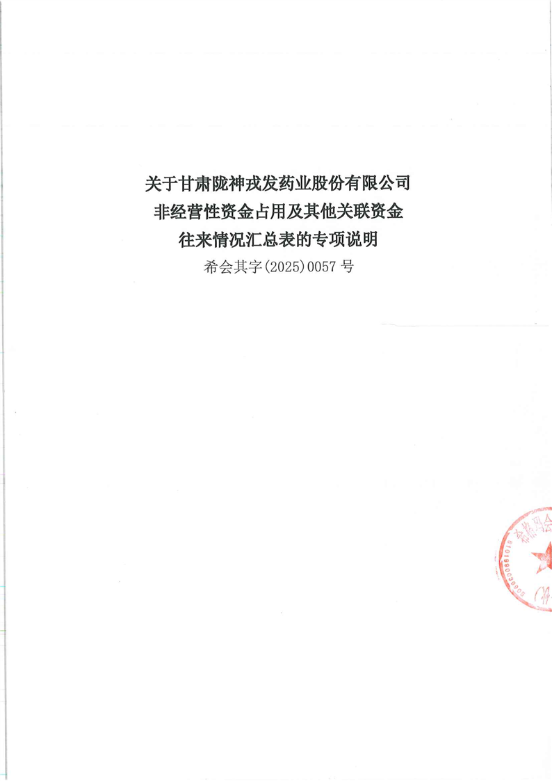 關(guān)于甘肅隴神戎發(fā)藥業(yè)股份有限公司非經(jīng)營性資金占用及其他關(guān)聯(lián)資金往來情況匯總表的專項說明