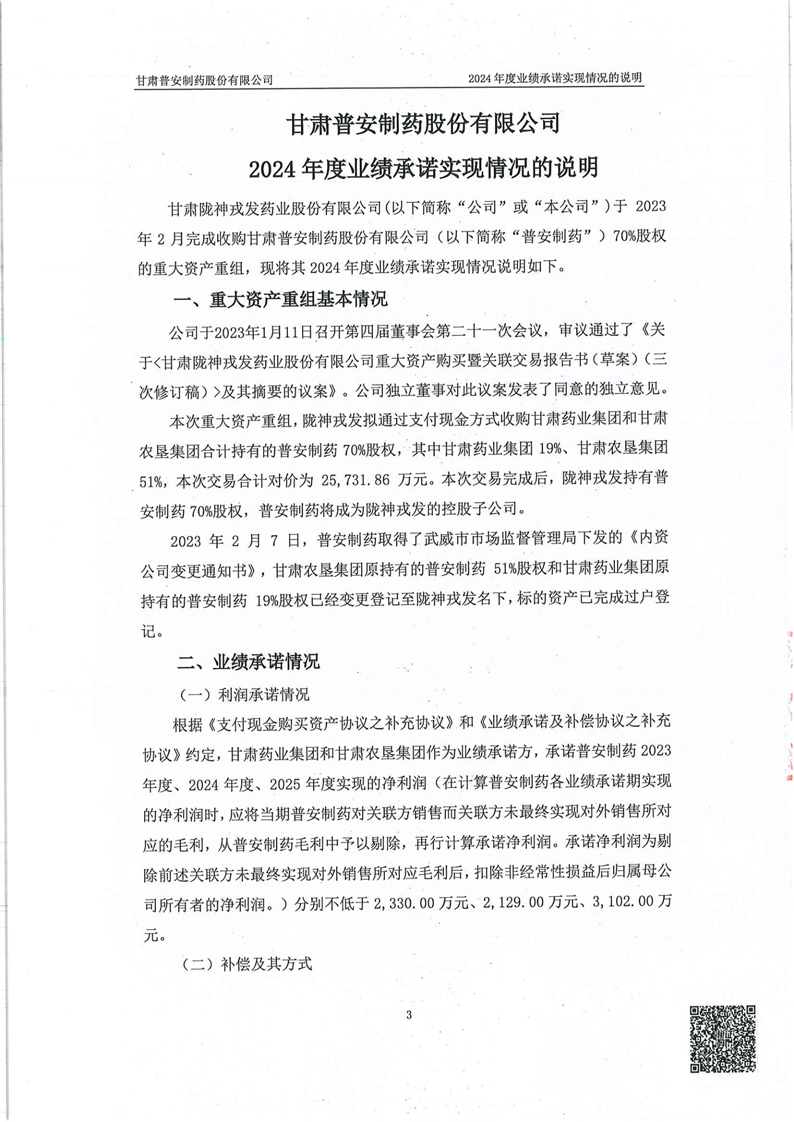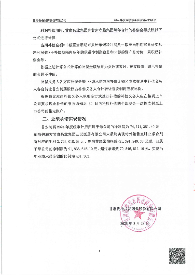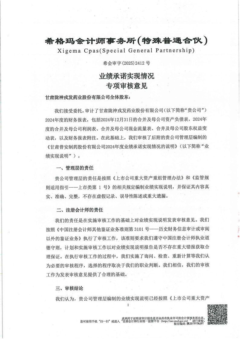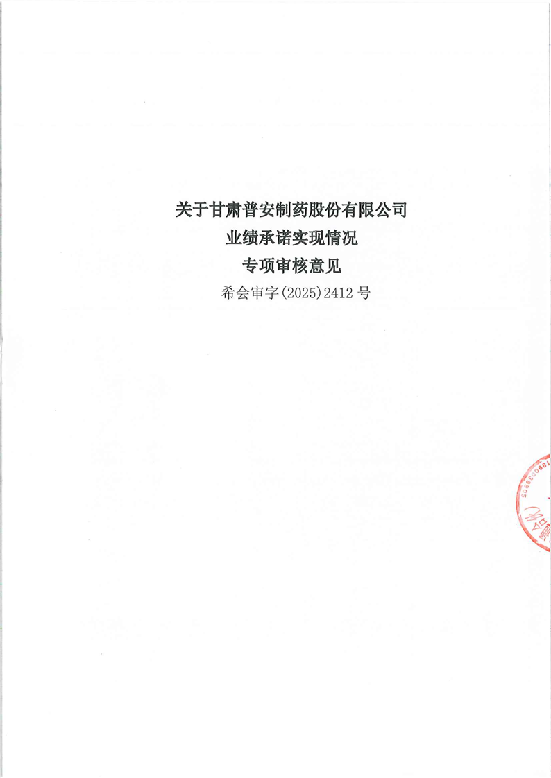 關(guān)于甘肅普安制藥股份有限公司業(yè)績承諾實現(xiàn)情況專項審核意見