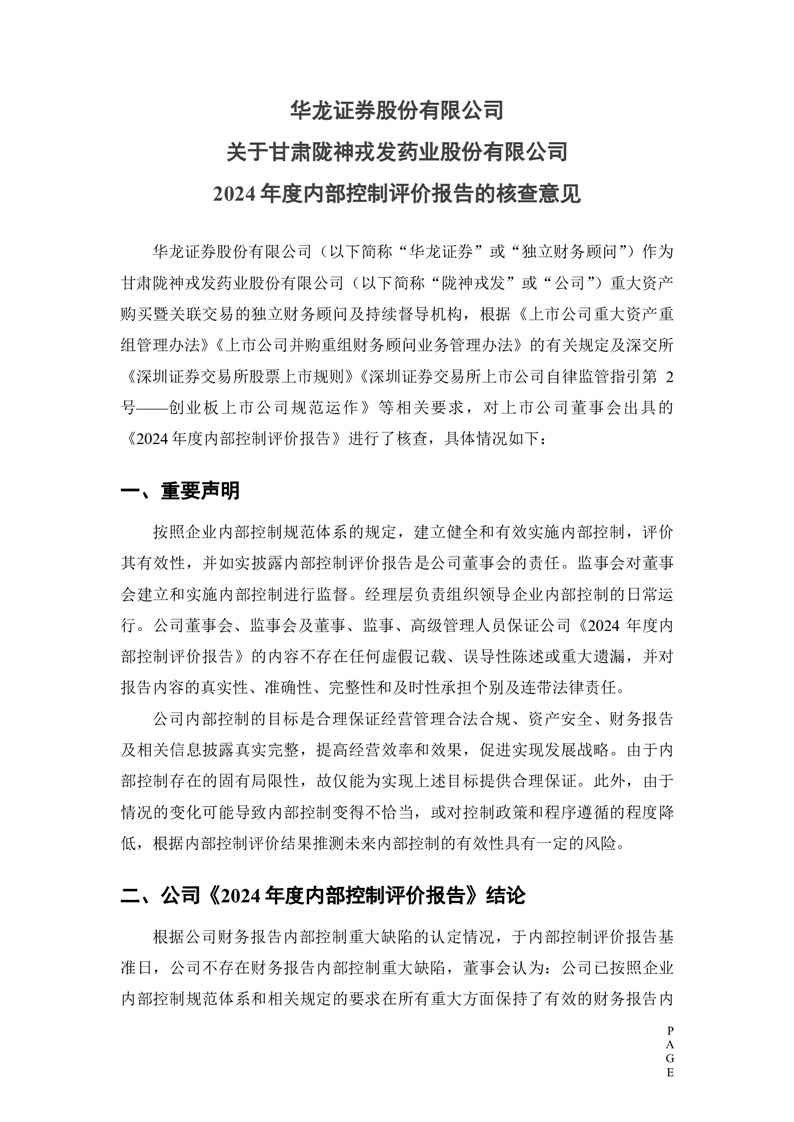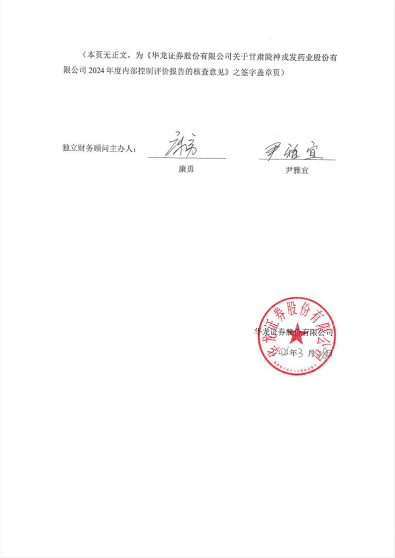 華龍證券股份有限公司關(guān)于甘肅隴神戎發(fā)藥業(yè)股份有限公司2024年度內(nèi)部控制評價(jià)報(bào)告的核查意見