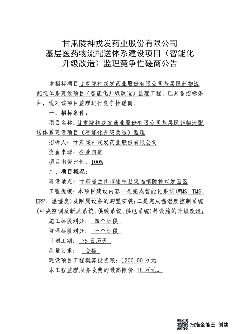 甘肅隴神戎發(fā)藥業(yè)股份有限公司基層醫(yī)藥物流配送體系建設(shè)項(xiàng)目(智能化升級改造)監(jiān)理競爭性磋商公告